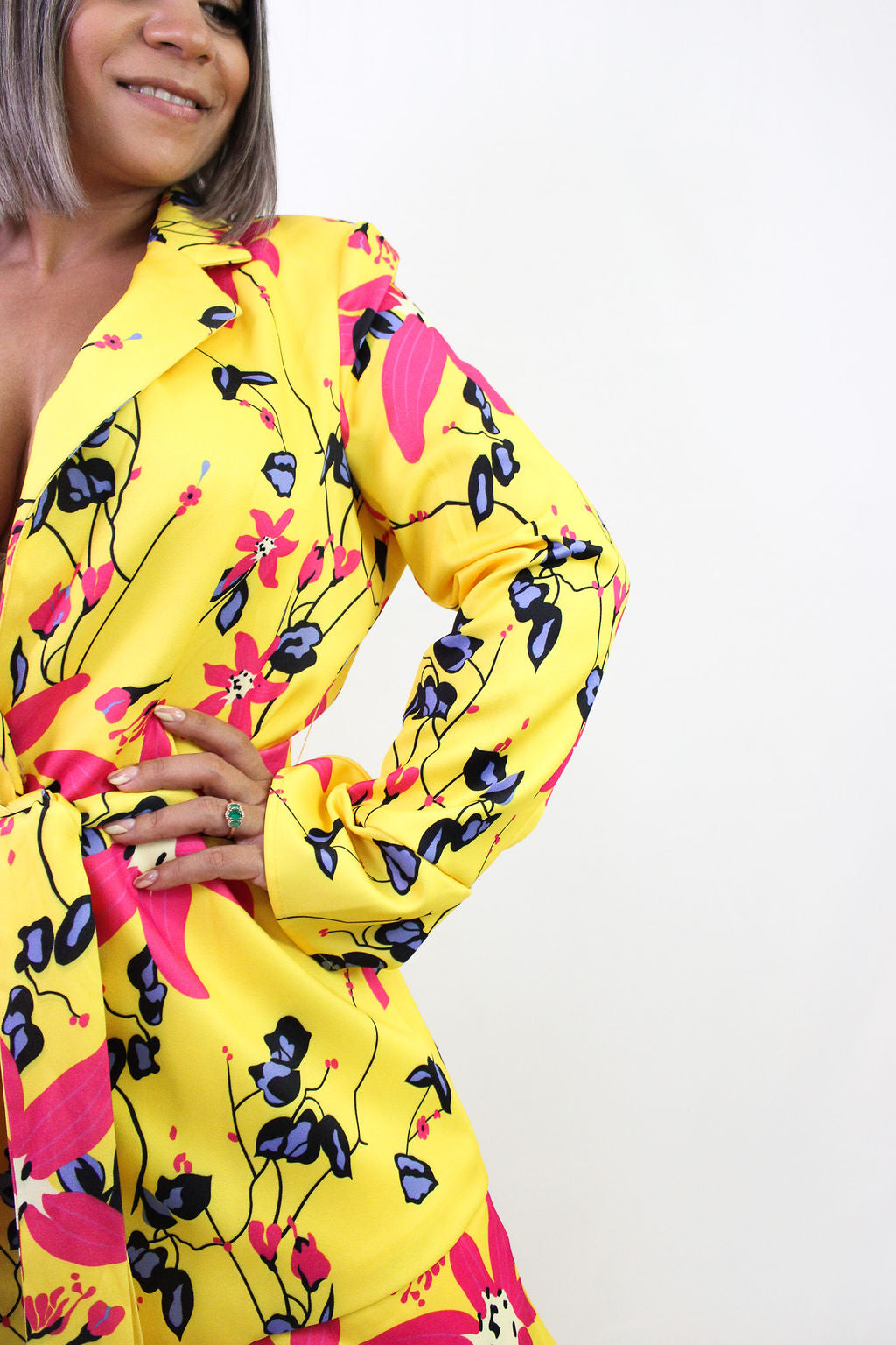"Experience the perfect combination of style and comfort with our Sintra set. Featuring a long yellow pants and a long-sleeved jacket adorned with beautiful pink flowers, this set will elevate your look and keep you feeling fresh all day long."